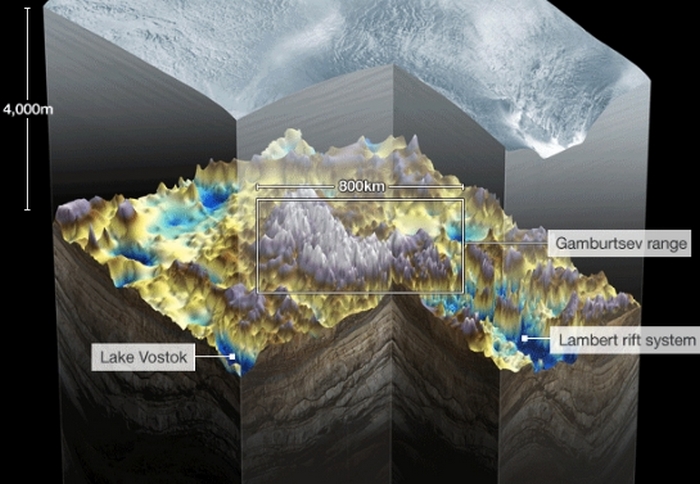 Горы, поднимающиеся до заоблачных высот, находятся.. под 600-метровой толщей льда в Восточной Антарктиде. Гряда Гамбурцева простирается более чем на 1 200 километров, а отдельные пики в ней достигают высоты 3 400 метров. Группа советских исследователей впервые открыла эту горную цепь в 1957 году в очень отдаленном районе континента, где температура часто опускается ниже -80 градусов по Цельсию.