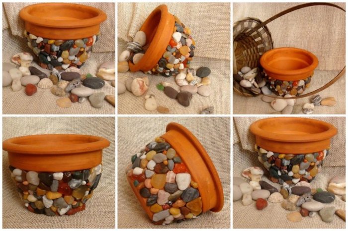 Глиняный горшок, украшенный мелкими морскими камушками.