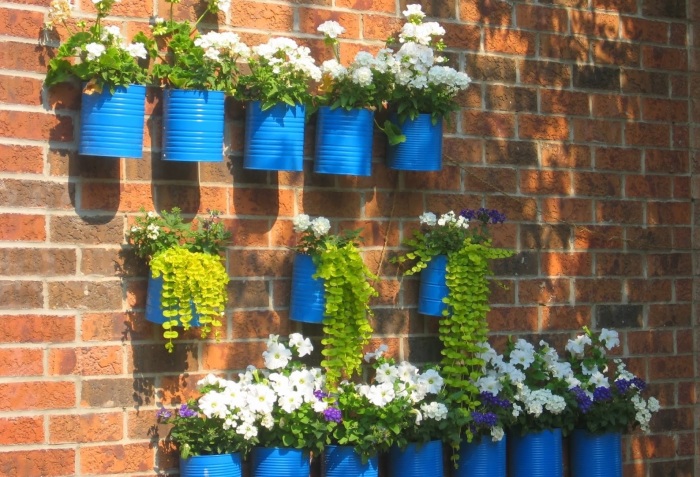 Вертикальное украшение стен растениями в горшках из жестяных банок.