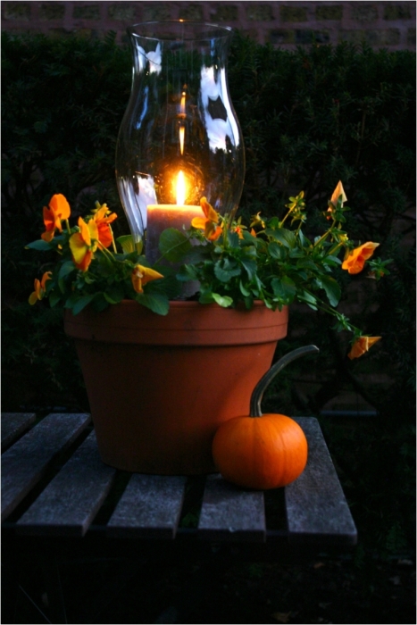 Горшок со свечой, создающий романтическую обстановку в саду.
