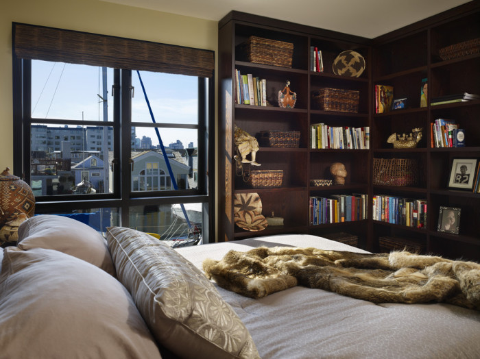 Многочисленные полки украсят интерьер спальни.