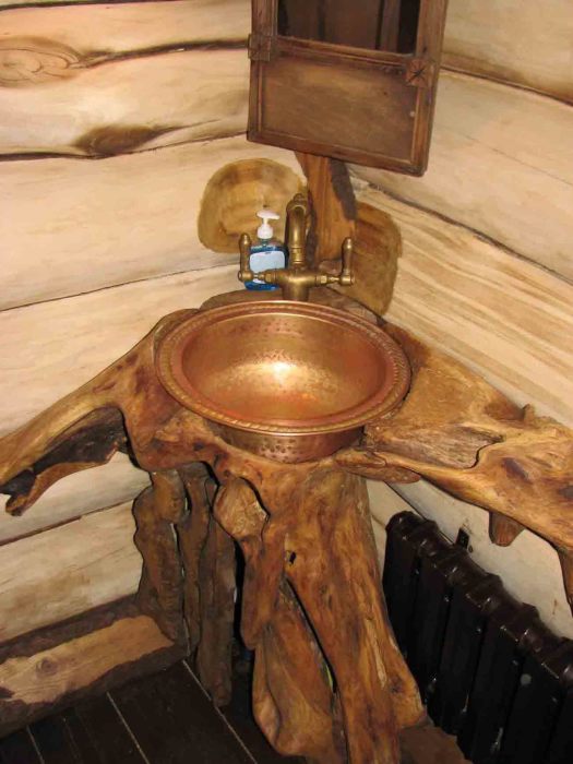 Сочетание дорогой породы дерева и металла в интерьере ванной комнаты.