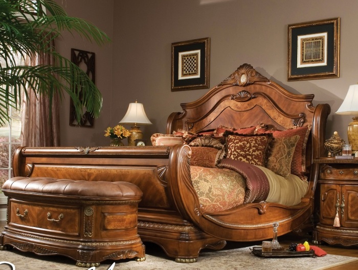 Кровать, выполненная из дорогой древесины в викторианском стиле.