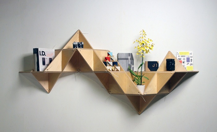 Крутой вариант обустроить стену комнаты с помощью красивых треугольных полок.
