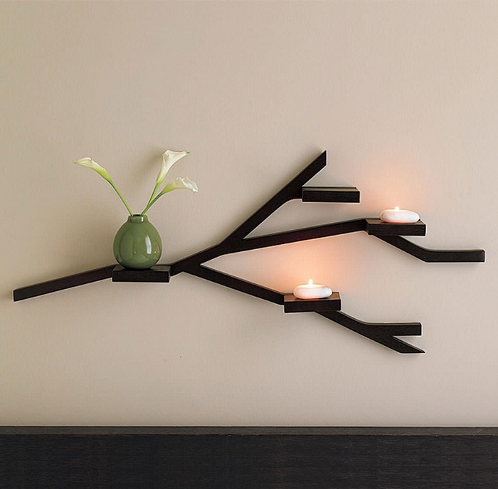Удачное решение украсить стену деревянной полкой в виде ветки дерева.