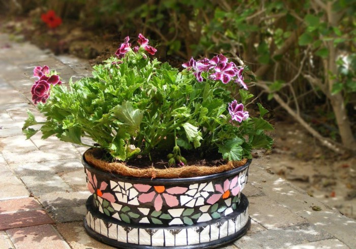 Цветы в горшке, декорированном плиткой, выглядят еще красивее.