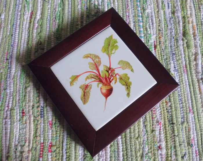 Однотонная керамическая плитка становится нестандартной основой для рисунка, заменяя бумагу или холст. Если вы уверены в собственных художественных навыках – творите на одной или нескольких плитках, приклеенных на общую основу, при помощи красок для стекла или керамики. Готовую композицию дополните подходящей по стилю и размеру рамой.