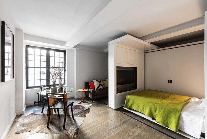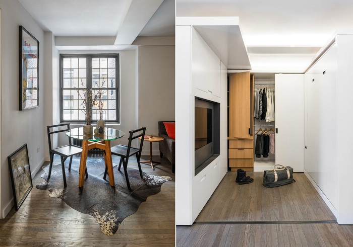 Дизайнер Брейден Колдуэлл (Braden Caldwell) и архитектор Майкл Чен (Michael Chen) отлично поработали над перепланировкой квартиры-студии в многоквартирном доме на Манхэттене. На 36 квадратных метрах им удалось воспроизвести целых 5 функциональных пространств: гостиную, кухню, спальню, столовую и рабочий кабинет.