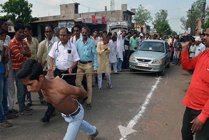 18-летний Абхишек Чоуби из индийского Мадхья-Прадеш сумел протащить Hyundai Accent GvS 2004 года на расстояние 27,5 метров, на что ему понадобилось 48 секунд. При этом юноша использовал только свои лопатки и сумел превзойти предыдущий рекорд Гиннеса на 5 метров. Как же ему удалось это. Один конец веревки был прикреплен к авто, а другой к крючку на деревянном бруске, который Абхишек Чоуби зажал лопатками.