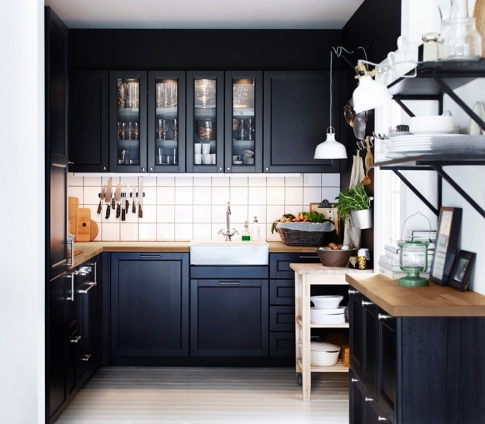 Для дизайна маленьких угловых кухонь чаще всего выбирают светлые цвета. Такое решение сложно назвать неразумным. Но темные и насыщенные цвета фасадов также могут стать отличным выбором. Компактная угловая кухня темного цвета не будет выглядеть слишком мрачно и массивно, в отличие от крупных моделей.