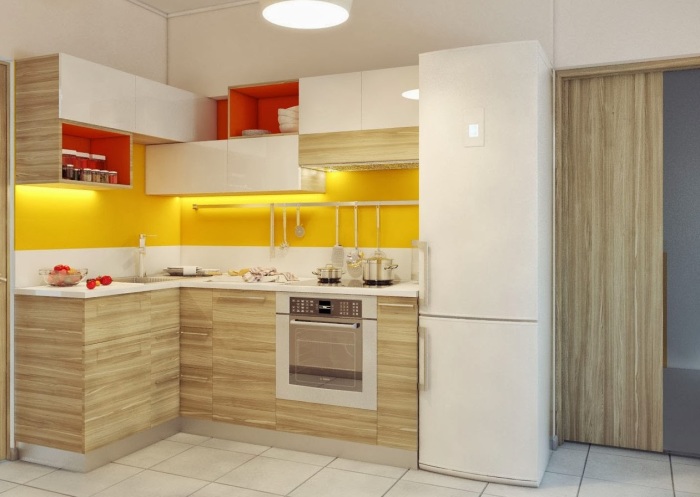 На первый взгляд может показаться, что дизайн угловой кухни не может быть оригинальным. Ведь ее компактность накладывает серьезные ограничения на конструкцию и форму. Но эффективные способы оживить дизайн существуют. Например, выбрать для фартука и столешницы материал одного цвета.